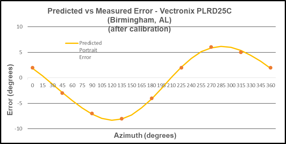 The ability to predict deviation errors of the Vectronix rangefinder was analyzed. The predicted error curve is the negative of the deviation curve; and the compensation method (again) proved quite effective. Compare the predicted error curve (solid line) with the actual measured azimuth error (orange dots).