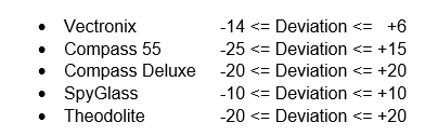 The range of residual compass azimuth deviation errors encountered (considering both test sites and all compasses tested) can be characterized as follows: