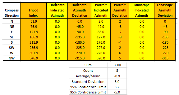 In order to collect the necessary azimuth data, the rangefinder/tripod head was rotated into and through each of the 8 cardinal compass directions to a) collect compass azimuth readings and b) determine the deviation errors – as necessary.