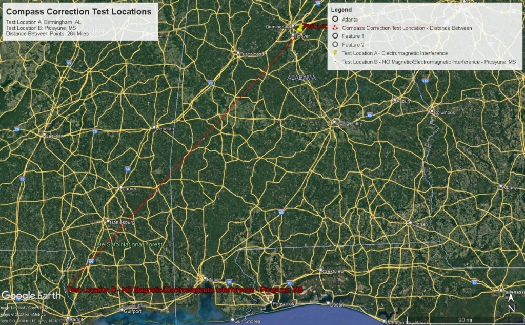 In the next post, the Vectronix laser rangefinder will be tested at the Picayune, MS agricultural test site – with NO adverse environmental (magnetic or electromagnetic) influences. Recall that the Picayune, MS test site is located 264 miles to the Southwest of the Birmingham, AL test site. It will be interesting to note that the change in latitude had no appreciable effect on the performance of the azimuth error compensation method – even when the author elected not to re-calibrate the Vectronix rangefinder prior to that test.