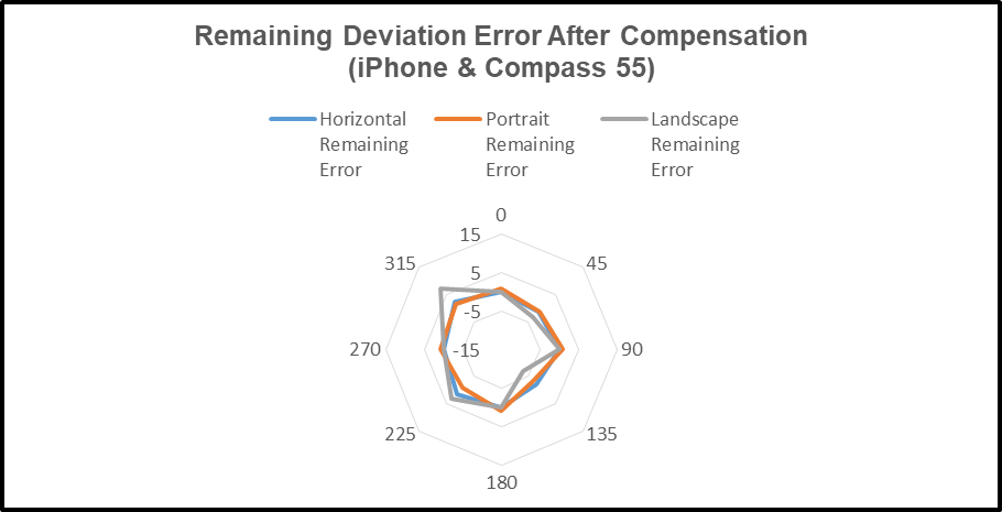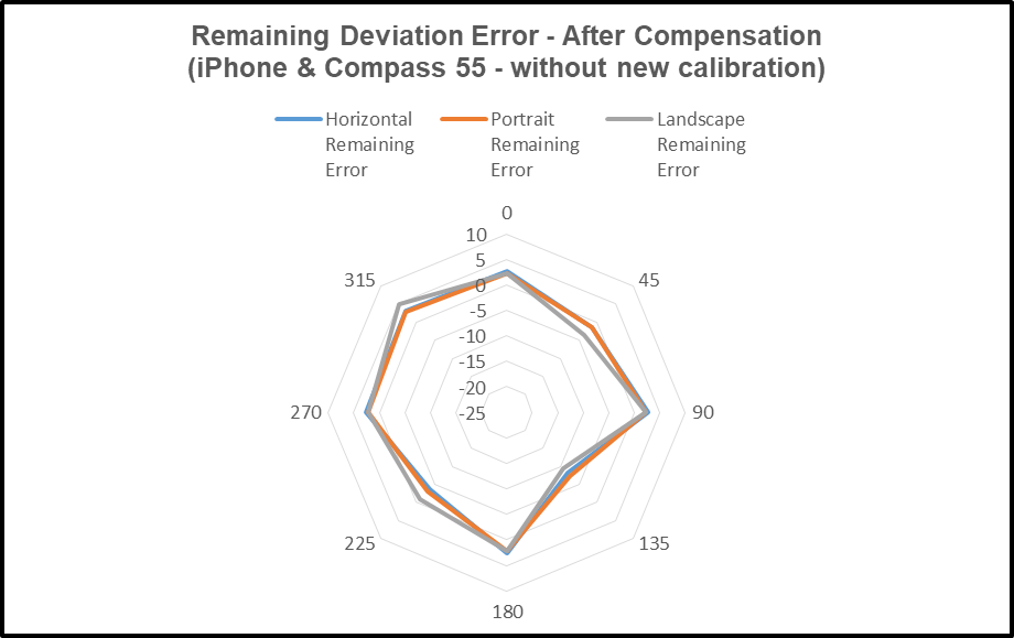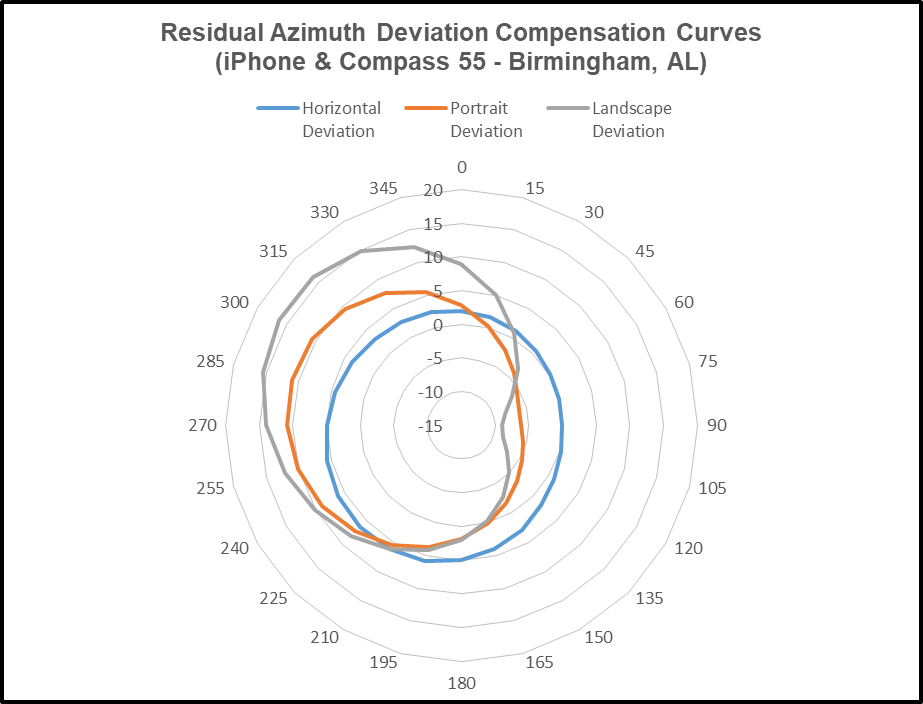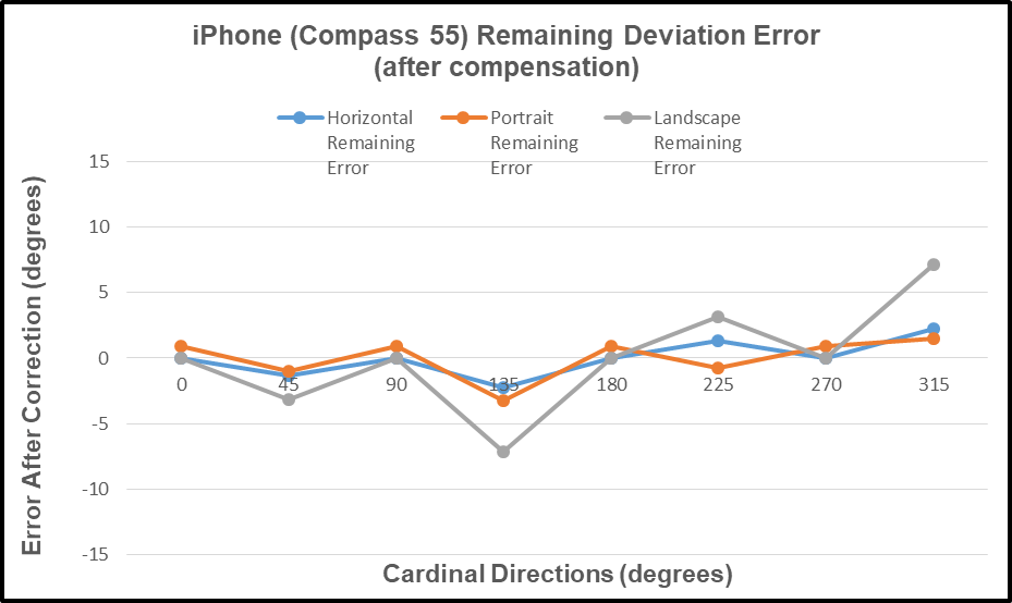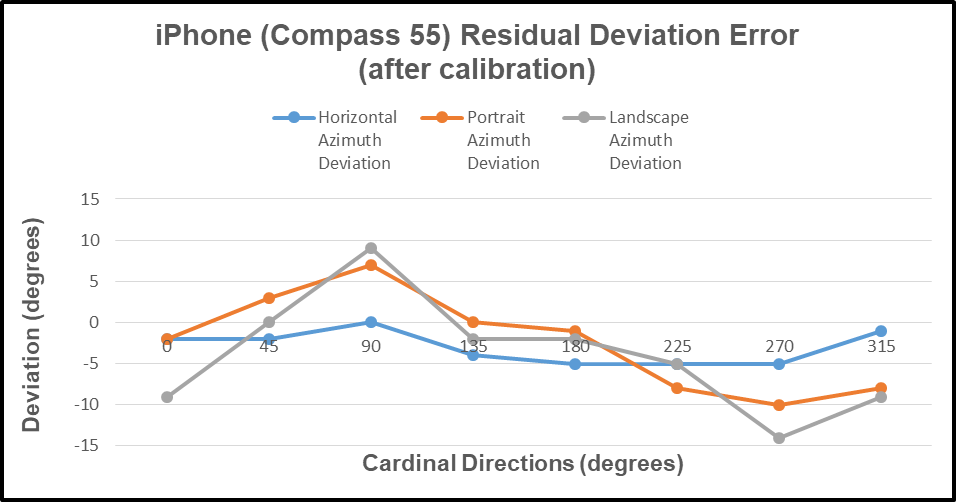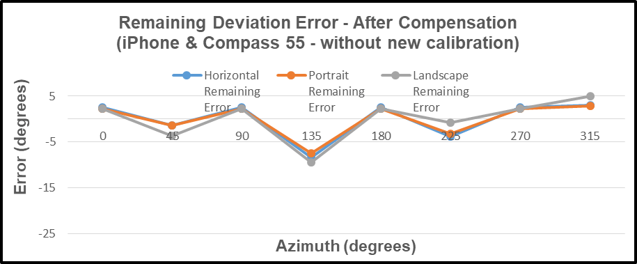 Recall that the iPhone Compass 55 app’s measured residual deviation (azimuth) errors were (quite adequately) compensated in each test.
