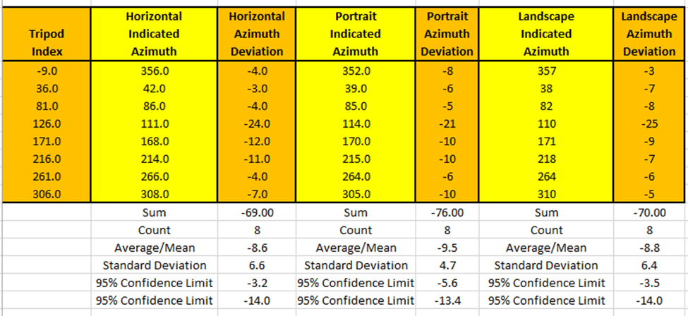 Recall: A residual (after calibration) compass deviation error persists throughout the entire 360 degree range of measurement. The following data table presents the collected azimuth data (yellow) and the associated azimuth deviation error (orange). The data collection operations with the iPhone Compass 55 app were performed using three iPhone orientations – Horizontal, Portrait, and Landscape.