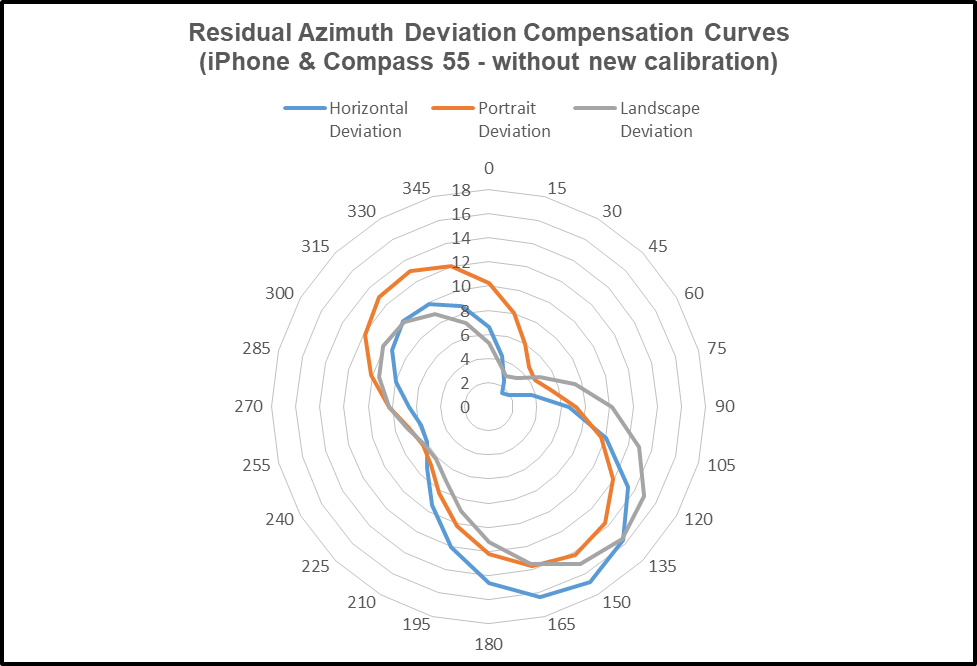 Notice that the azimuth deviation (error) is different for each orientation of the iPhone. The Compass 55 app has done its best – yet residual compass azimuth deviation (error) persist.