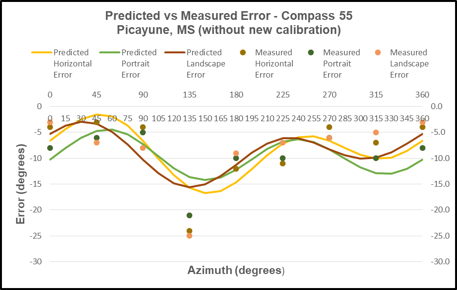 The predicted deviation errors for the iPhone Compass 55 app are depicted in the following chart. The predicted error curves are the negative of the deviation curves; and the compensation method proved quite effective.