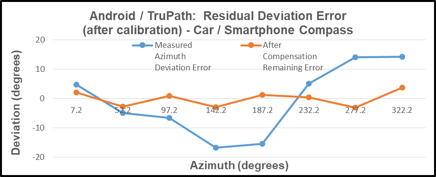 - Residual (after calibration) compass azimuth deviation error exists; and the error magnitude varies throughout the entire 360 degree range of measurement.
