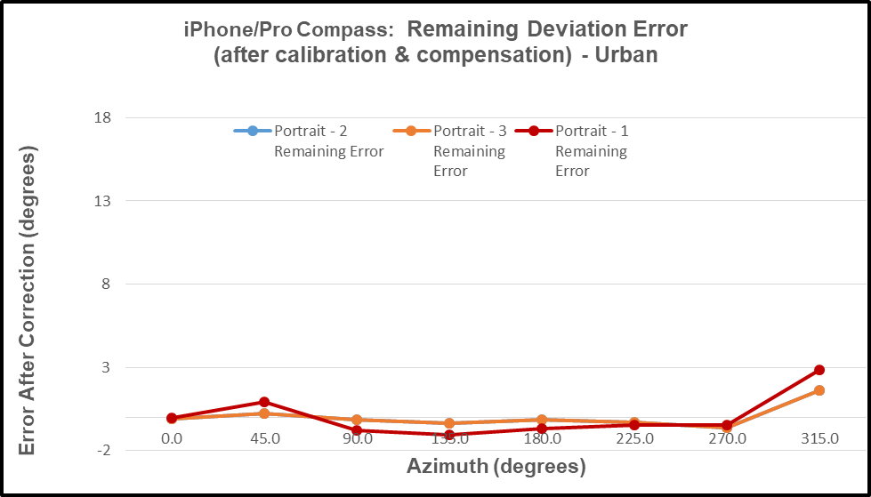 - Residual (after calibration) compass azimuth deviation error exists; and the error magnitude varies throughout the entire 360-degree range of measurement.