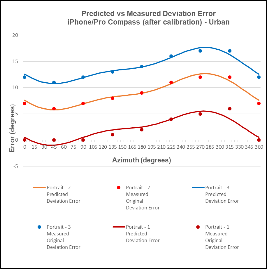 - The data collected about the compass azimuth deviation error must be “modeled” in such a way that the predicted error can be “added back” (subtracted) from the original erroneous azimuth readings to compensate (correct) the error(s) – in a repeatable and reliable manner over the entire 360-degree range of measurement – within the local environment, over a wide geographic area.