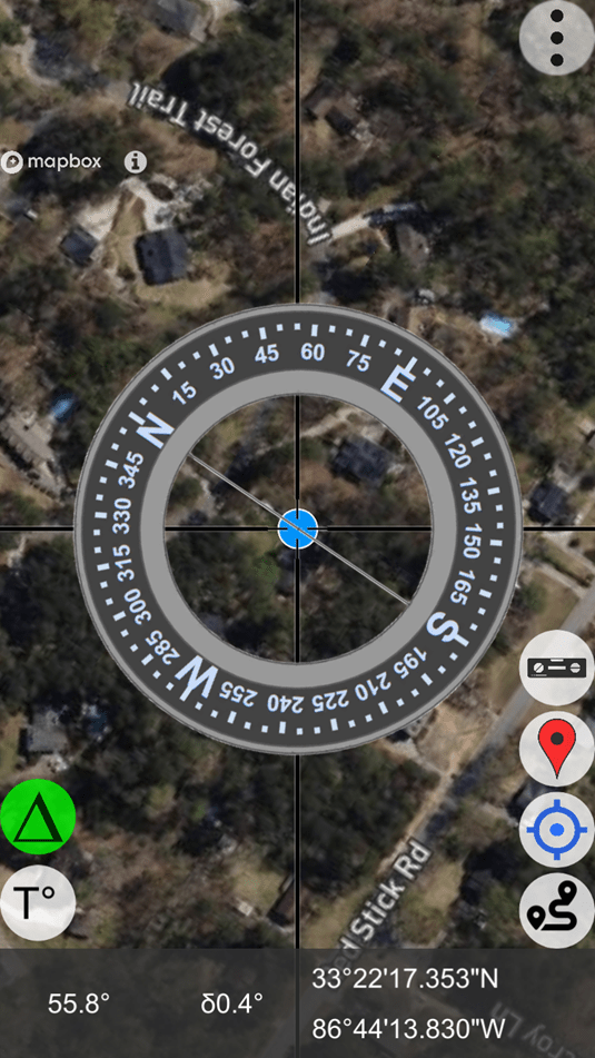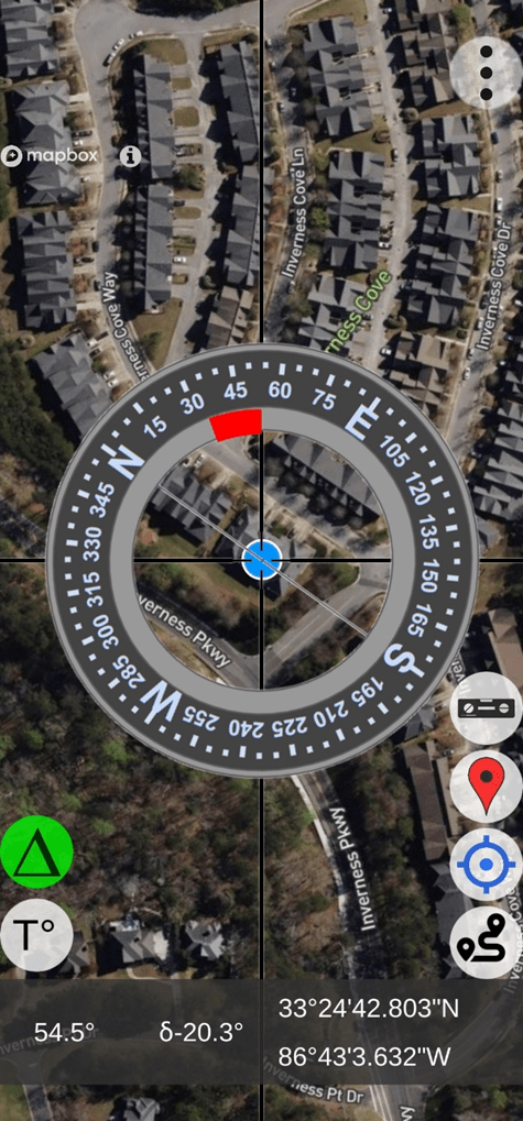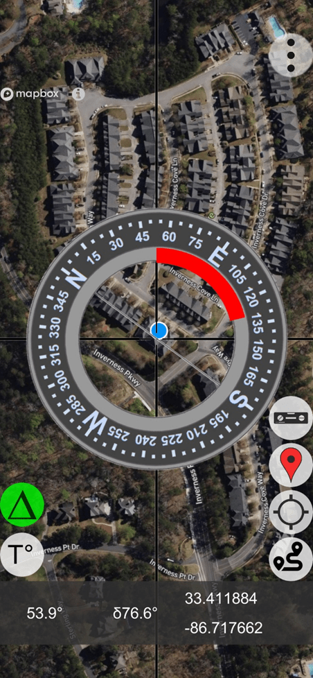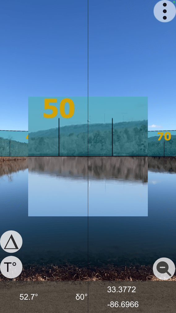 To help locate the distant feature on the Map screen, the user can access the Live View screen (below) to obtain an initial (uncorrected) azimuth toward the distant object – about 53 degrees.