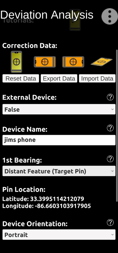 Under “Correction Data” (image above), notice four phone orientation symbols – Portrait, Landscape (left), Landscape (right), and Horizontal. The Portrait symbol is green indicating that correction data has already been collected from a previous location – for the Portrait orientation; and that’s OK. When we collect fresh deviation data from the current site for the Portrait orientation, the older data will be replaced.