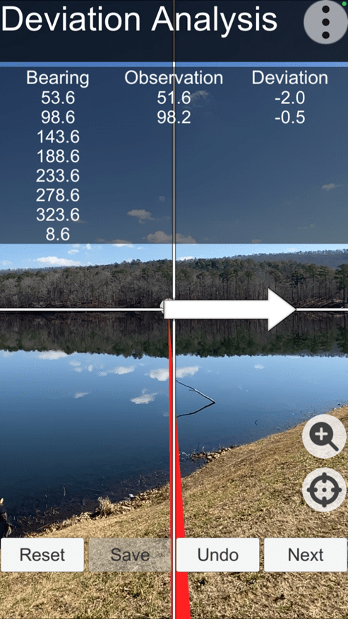 After all the necessary parameters have been selected, the user will scroll to the bottom of the Deviation Analysis setup screen and click on the “Next” button to start the deviation data collection process. Collect the first deviation data point (targeting the water tower) by touching the active screen.