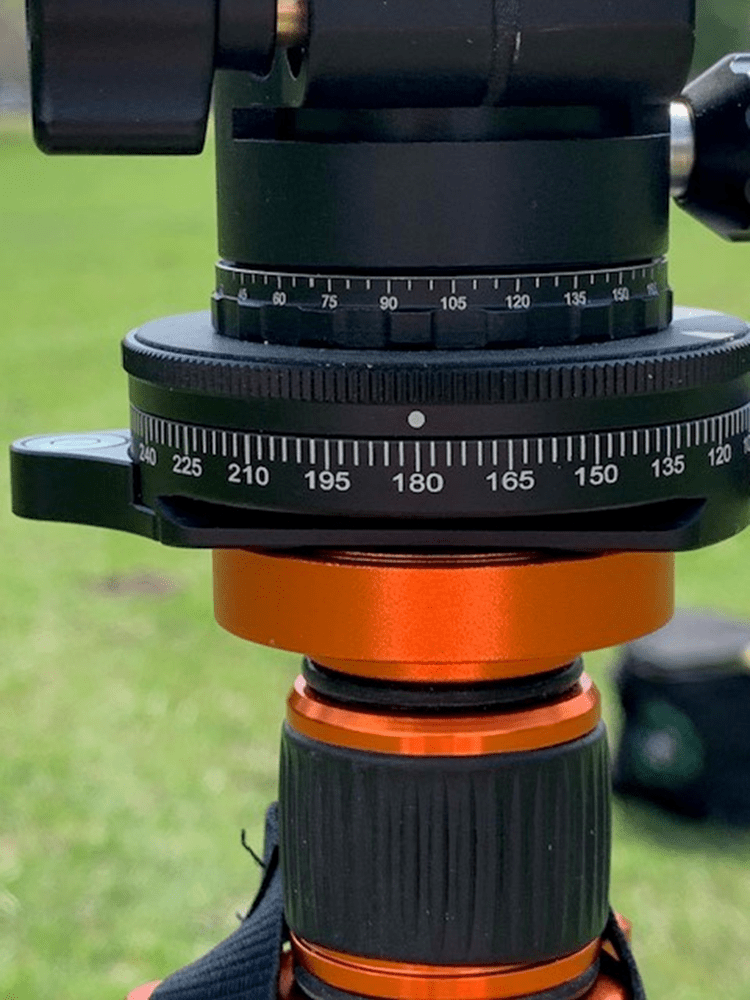 When proper alignment occurs (time-of-day), make careful note of the index on the azimuth ring of the tripod. This index reading (180) becomes the “base index” for using the index ring to a) find the True North direction as well as b) find the directions for all the remaining cardinal directions of the compass.