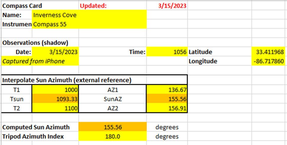 From the spreadsheet illustration below, note that the sun’s azimuth has been determined (interpolated using date/time-of-day/geographic position) to be 155.56 degrees. Subtracting the sun’s azimuth from the tripod’s base index value (for starters), we can see all the index readings we must use to locate the cardinal directions of the compass. First, rotate the tripod head counter-clockwise through 155.56 degrees (from the base index) to find True North (tripod index = 24.4). Next, rotate the tripod head clockwise (consecutively) to each indicated (below) index reading to position the tripod head correctly for the remaining cardinal compass headings – at each position/direction, smartphone compass readings [using a well-known app] will the collected/recorded.